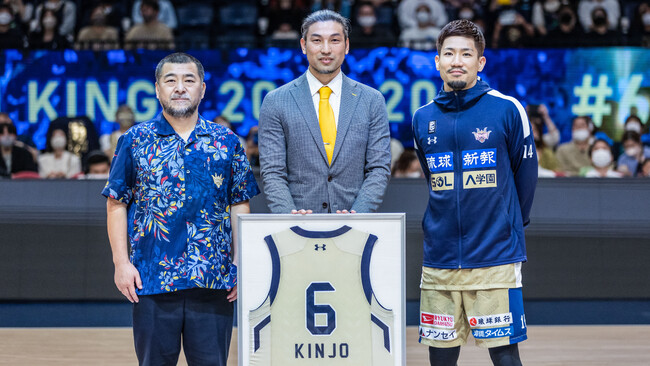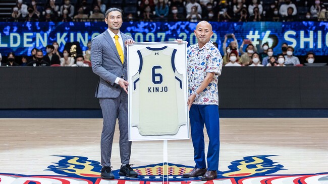 永久欠番セレモニーでは金城氏のキャリアを振り返る特別映像放映後、bjリーグ初年度から使用されていた懐かしい選手入場BGMと共に金城氏が登場し、安永ゼネラルマネージャーより背番号「6」の永久欠番ユニフォームが贈呈されました。