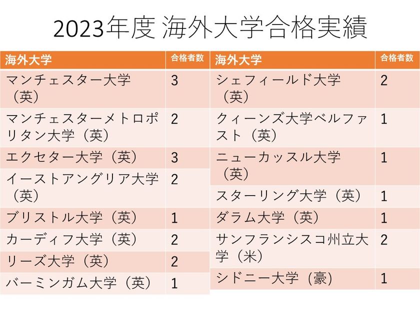 そして2023年度入試では、海外協定大学推薦制度を利用して、イギリスの大学に22名、アメリカの大学に2名、オーストラリアの大学に1名合格しました。このうち、イギリスの大学に1名進学予定です。