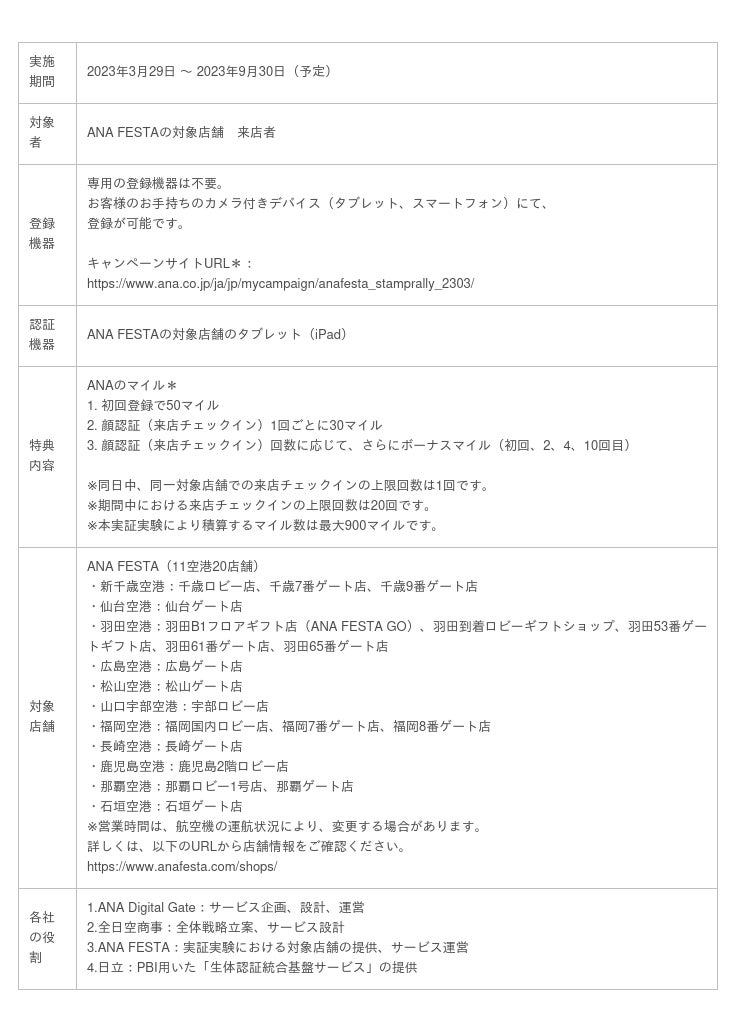 ANA Digital Gate株式会社(以下、ANA Digital Gate)、全日空商事株式会社(以下、全日空商事)、ANA FESTA株式会社(以下、ANA FESTA)、株式会社日立製作所(以下、日立)の4社は、本日3月29日より、空港内ギフトショップANA FESTAの対象店舗(11空港20店舗)において、来店時にマイルが貯まる「顔認証スタンプラリー」に関する共同実証実験を実施します。当実証実験のサービス基盤には日立の特許技術PBI※1を活用し、顔情報を復元不可能な形に暗号化することで、安全・安心な生体認証を実現しています。