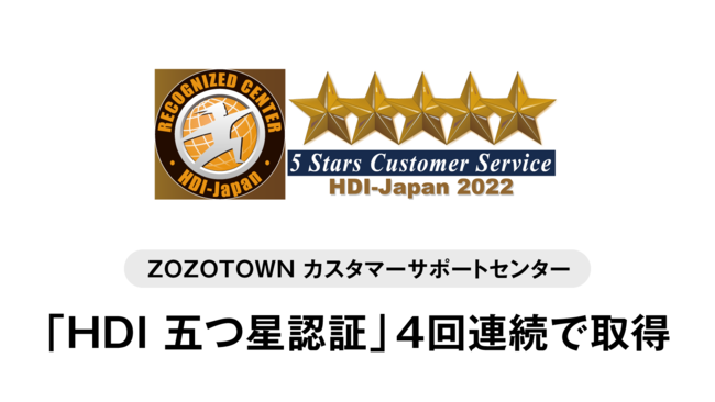 株式会社ZOZO(本社:千葉県千葉市 代表取締役社長兼CEO:澤田 宏太郎)が運営するファッションEC「ZOZOTOWN」(https://zozo.jp/)のカスタマーサポートセンターは、「HDI-Japan」が提供する「HDI 五つ星認証プログラム」において、最高評価である「五つ星認証」を取得いたしました。アパレル業界では初の4回連続取得(※1)となり、メールやチャットでのテキストコミュニケーションに特化したカスタマーサポートを行う企業では当社が唯一の五つ星認証です(※2)。