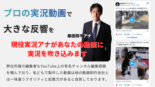 株式会社Chanseyの代表柴田は現役のプロのアナウンサーであり、多くの実況の経験からSNSでバズる実況付きのショート動画を自身のSNSでもアップしてきました。そのような実況つきのショート動画制作をサービスとしてリリース。100万再生を超える動画を何本も制作してきた実績があります。
