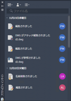 コラボレーションによる AutoCAD のワークフローにおける情報ギャップを解消し、プロジェクトのライフサイクル全体を通じて、常に必要なデータに接続できるようにします。アクティビティ インサイトによって、図面ファイルに対するイベントを常に把握でき、プロジェクトライフサイクル全体を通じて、DWG ファイルにおける複数のユーザーアクティビティの詳細にアクセスできるため、ローカルや LAN、クラウドサーバー上に保管される図面ファイルの利便性が高まります。