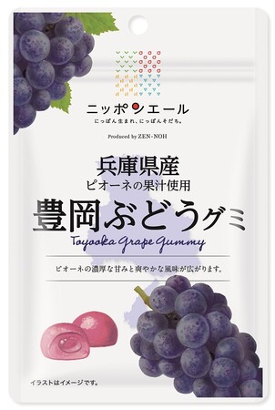 ニッポンエールの人気のグミシリーズに豊岡市産ピオーネの果汁を使用した「豊岡ぶどうグミ」として、初めて兵庫県産が登場。「豊岡ぶどう」はコウノトリの野生復帰をめざす兵庫県の但馬地区(豊岡市)で、慣行に比べ農薬・化学肥料の使用を抑えて栽培した、安全・安心のブドウです。