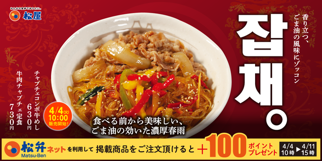 4月4日10時~4月11日15時まで、松弁ネットを利用して「牛肉チャプチェ定食」「チャプチェコンボ牛めし」関連商品をご注文頂けると、100ポイントプレゼントいたします。