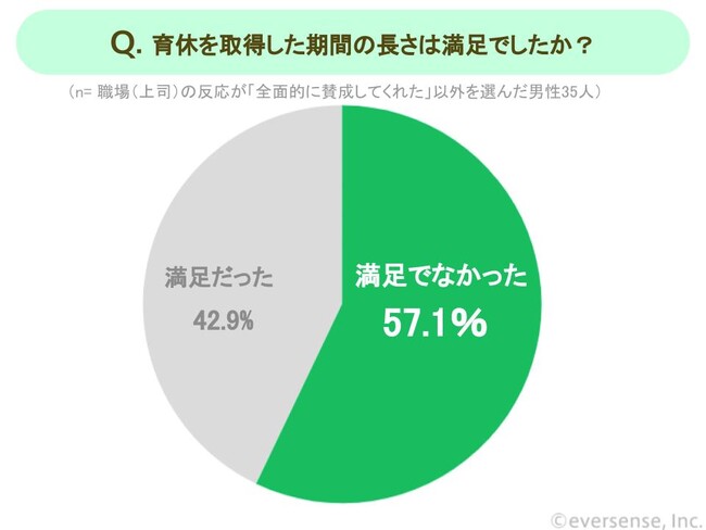 「職場(上司)に育休を取ることを相談したとき、職場(上司)の反応はどうでしたか?」という質問に対し、「全面的に賛成してくれた」以外を選択した男性は32.8%。さらに、取得期間への満足度を調査したところ、全面的に賛成されなかった男性のうち57.1%が「満足でなかった」と答える結果となりました。