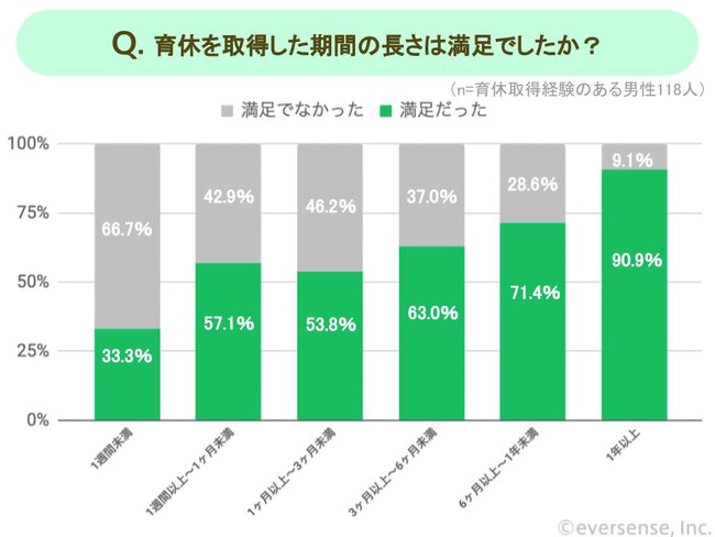 育休取得期間が1年以上の男性は90.9%が期間に「満足だった」と回答しているのに対し、取得期間1週間未満の男性はわずか33.3%にとどまりました。また、取得期間1週間未満~3ヶ月未満の結果を見ると、51.9%もの男性が期間に対して「満足でなかった」と回答しました。
