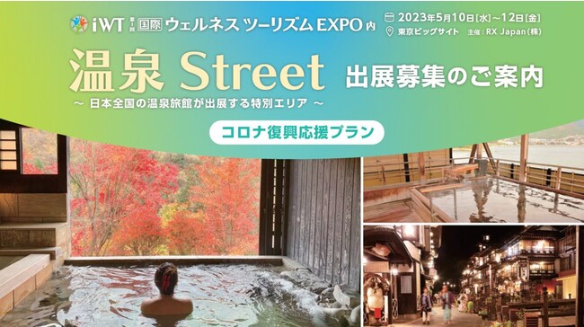 RX Japan株式会社は、2023年5月、日本初となるウェルネスツーリズムに特化した商談展示会「第1回 国際 ウェルネスツーリズム EXPO」を開催いたします。その中の特別企画として「温泉Street」を立ち上げました。温泉旅館/施設の活性化を応援するための”コロナ復興応援プラン”です。通常よりも安価に、且つ簡単に出展する事ができます。