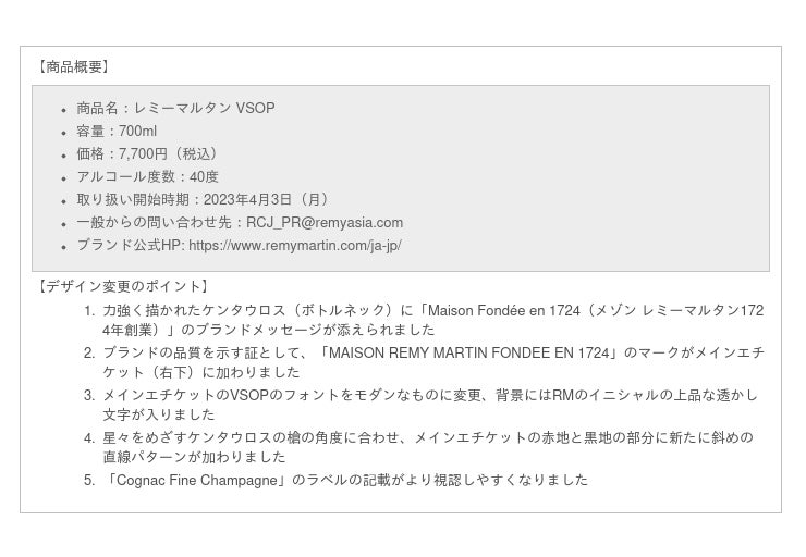コニャック・フィーヌ・シャンパーニュ『レミーマルタン』は、取り扱う「レミーマルタンVSOP」700mlのボトルデザインを刷新することを決定。2023年4月3日(月)取り扱い分より、新デザインボトルでの販売を開始いたします。