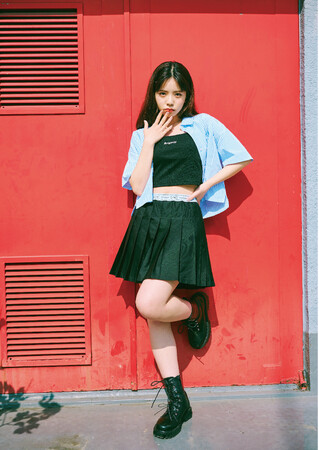 トレンドのストライプシャツはウエストロゴのプリーツミニと合わせてのK-POPアイドル風。
