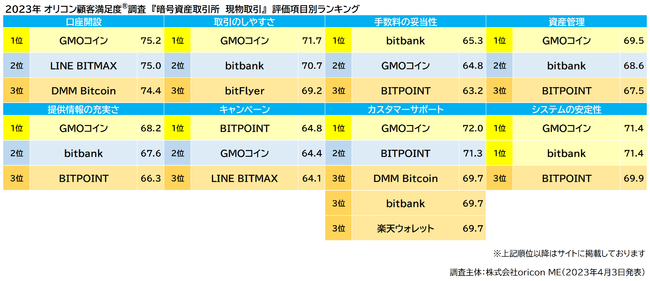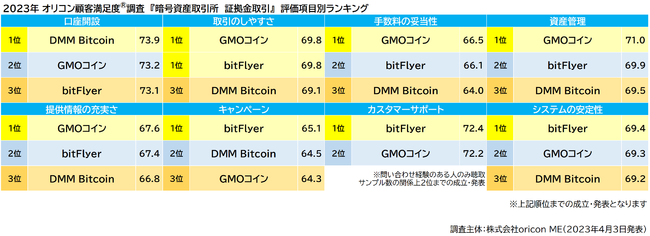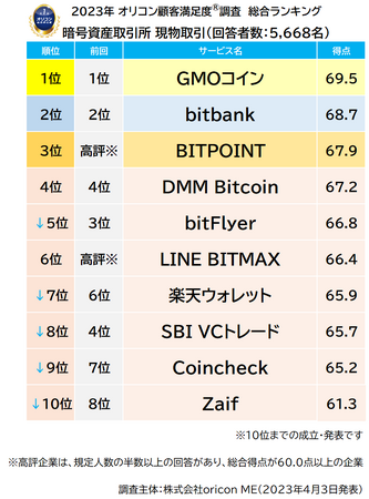 実際のサービス利用者を対象に第三者の立場で顧客満足度調査を実施する株式会社oricon ME(よみ:オリコン エムイー 本社:東京都港区 代表取締役社長:小池 恒 略称:オリコン)は、『暗号資産取引所』についての満足度調査を実施し、2023年4月3日(月)14時にその結果を発表いたしました。結果は、以下の通りとなりました。
