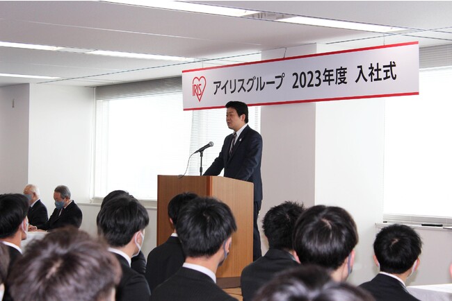 アイリスグループは、本日、アイリス卸町ビル(宮城県仙台市)において、2023年度入社式を執り行いました。今年度は計574名(大学・高専・専門・短大卒383名、高卒191名)の新入社員が入社しました。