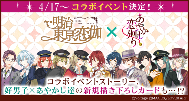 株式会社ボルテージ(本社:東京都渋谷区 代表取締役:津谷 祐司)は、提供中のボル恋タイトル「あやかし恋廻り」 にて、株式会社MAGES.(本社:東京都港区 代表取締役:本荘 健吾)が運営する歴史恋愛ファンタジーゲーム「明治東亰恋伽」とのコラボレーションが決定したことをお知らせいたします。