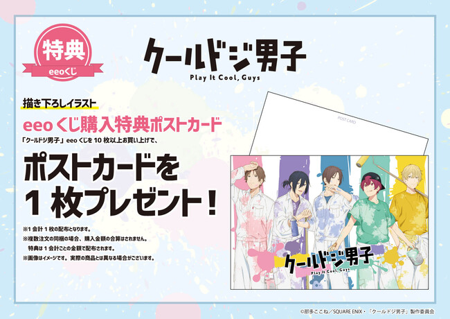 『クールドジ男子』の「eeoくじ」を1会計10枚以上お買い上げで、ポストカードをプレゼントしています。当たった景品と一緒にぜひ飾ってください♪▼発売は4月3日~5月2日まで▼「eeoくじ」のご購入はこちらから!https://eeo.today/store/101/title/198?utm_source=prtimes&utm_medium=press&utm_campaign=prt3822022年10月より放送されたTVアニメ『クールドジ男子』。「eeoくじ」でも、ドジさえもクールにキメる愛され男子たちに癒されること間違いなしです。くじを引くワクワクを満喫しつつ、ここでしか手に入らないアイテムと共にイケメン男子5人をこれからも推していきましょう!(C)那多ここね/SQUARE ENIX・「クールドジ男子」製作委員会eeo Store初のオンラインくじ「eeoくじ」