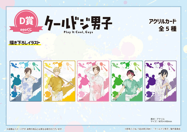 C賞には、約6×6cmの大きめアクリルキーホルダーが登場! キャラクターカラーを全面に出したデザインが、目も心も楽しませてくれます。いつでもどこでも、『クールドジ男子』をそばに感じてください♪▼eeo Storeへ▼「eeoくじ」のご購入はこちらから!https://eeo.today/store/101/title/198?utm_source=prtimes&utm_medium=press&utm_campaign=prt382D賞 アクリルカード(全5種)