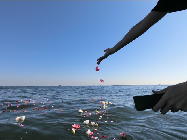 出航から30分程度で散骨ポイントに到着。実際の散骨クルーズと全く同じ流れに沿って、海洋散骨を体験。水溶紙に包み、ご遺骨に見立てた食塩をおひとりずつ花びらと一緒に海へ撒いていただきます。