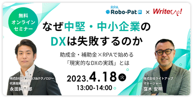 そこで本セミナーでは、導入1,000社・顧客満足度No.1※1のRPA「ロボパットDX」を提供するFCEプロセス&テクノロジーと、累計1万社以上の公的資金活用支援実績を持つライトアップが共同で、中小企業の現状に即したDXの実現方法と具体的なステップについて解説致します。