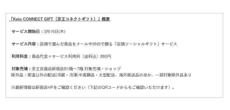 株式会社京王百貨店(本社:東京都新宿区、社長:仲岡一紀)新宿店では、店頭で選んだ商品をメールやSNSでギフト配送できるソーシャルギフトサービス「Keio CONNECT GIFT(以下、京王コネクトギフト)」をスタートしました。