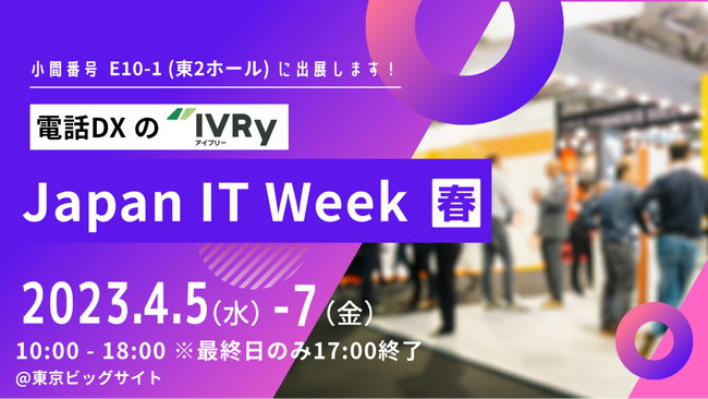 月額3,000円から使える電話自動応答サービス「IVRy(アイブリー)」を提供する株式会社IVRy(本社:東京都台東区、代表取締役CEO:奥西 亮賀、以下「当社」)は、2023年4月5日(水)から年4月7日(金)まで東京ビッグサイトで開催される「第32回 Japan IT Week 【春】」に出展することをお知らせいたします。(ブース番号:E10-1)