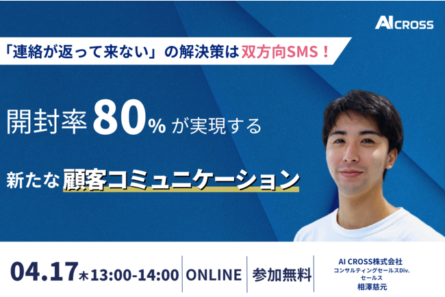 AI CROSS株式会社(本社:東京都港区、代表取締役CEO:原田典子、以下「AI CROSS」)は、当社主催の無料オンラインセミナー「『連絡が返って来ない』の解決策は双方向SMS!~開封率80%が実現する新たなコミュニケーション」を2023年4月17日(月)に開催します。