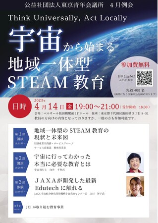 公益社団法人東京青年会議所 教育政策地区室(所在地:東京都千代田区平河町、理事長:下山田 敬介)は、2023年4月14日(金)19時~~Think Universally,Act Locally~宇宙から始まる地域一体型STEAM教育(ベルサール飯田橋駅前1Fホール)を開催いたします。
