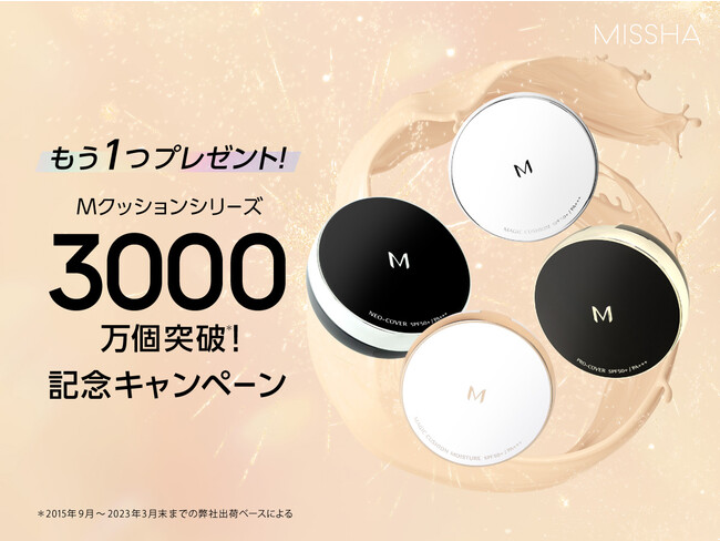 2006年に日本に上陸した、美肌を叶える韓国生まれのコスメブランド「MISSHA(ミシャ)」。日本での韓国コスメの火付け役とも言える“クッションファンデーション”をミシャでは2015年に初めて発売しました。以来、クッションファンデーションのパイオニア的存在として、歩みを続け、進化を遂げてまいりました。多くのご支持の声に支えられ、ミシャクッションファンデの中でも最も人気のクッションシリーズ「Mクッションシリーズ」がこの度シリーズ累計出荷数3000万個の出荷*を達成しました。ミシャのこの嬉しいニュースと共に、感謝の気持ちを込めたキャンペーンを実施いたします。