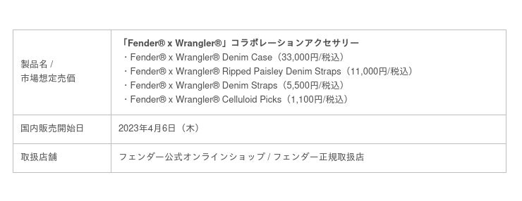 『Fender(R) × Wrangler(R)』のコラボレーション第二弾ギター/ベース アクセサリーコレクション2023年4月6日(木)より販売開始