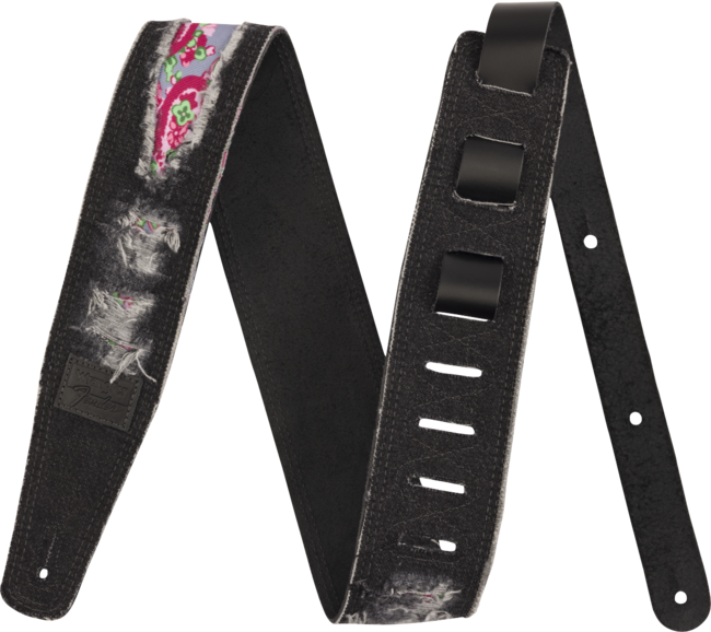 『Fender(R) x Wrangler(R) Ripped Denim Strap』は、決して捨てることができないお気に入りのジーンズのように、使い込まれたクラシックな風合いを出すためにディストレス加工が施されています。Wranglerを象徴するシームワークとカスタムレザーパッチ、そしてフェンダーらしいピンクペイズリー生地が特徴です。(カラー:Indigo / Black)