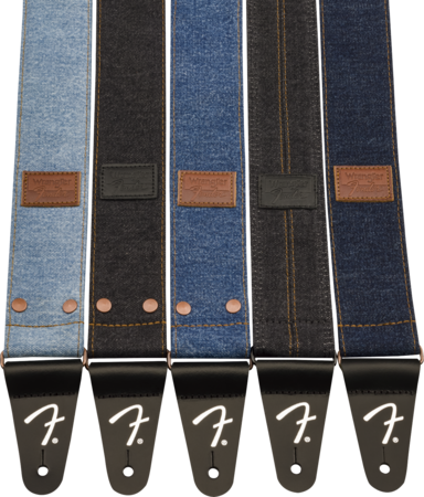 お気に入りのジーンズのように心地よくフィットする『Fender(R) x Wrangler(R) Denim Straps』は、ギターやベースに個性的なアクセントを与えます。象徴的なポケットデザインを踏襲し、ゴールドステッチ、カスタムレザーパッチワーク、銅製リベットとハードウェアを備えています。(カラー/写真左~右:Light Indigo / Black / Indigo / Washed Black Stitch / Dark Indigo)