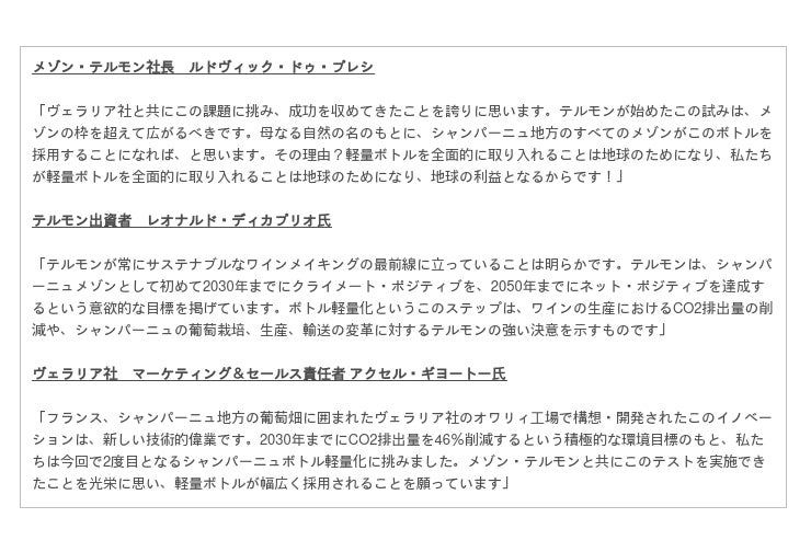 環境負荷の軽減や、「母なる自然の名のもとに」プロジェクトの目標である「2030年までのクライメート・ポジティブ」、「2050年までのネット・ポジティブ」の達成を目指すメゾン・テルモンにとって、800グラムボトルの標準採用を大きな前進として、今後も歩みを進めてまいります。