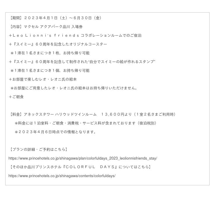 同イベントのコラボレーションルームも「品川プリンスホテル」にて室数限定でご用意しております。当館の入場券付きで、展示を楽しんだ後は“Leo Lionni’s friends”の仲間に囲まれた特別なお部屋で癒しのホテルステイをお過ごしいただけます。