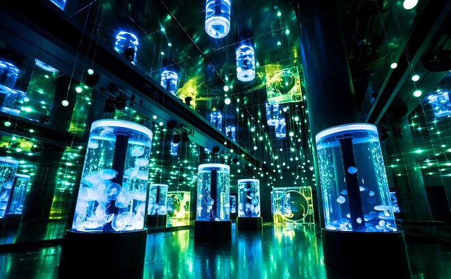 幅約9m×奥行約35mにもおよぶ空間に7つの円柱水槽と全面がクリスタルのシンボリック水槽が並び、「ミズクラゲ」「アカクラゲ」など多彩な種類をご覧いただけます。天井から下がる98個のLEDライトと音楽の演出は3分間の通常演出と交互に5分間のフラワーアクアリウム仕様で展開。ブルーやグリーンが基調のライティングが初夏の爽やかさを演出するとともに、クラゲたちと鏡面に広がる無数の光が“絶景”を創出します。