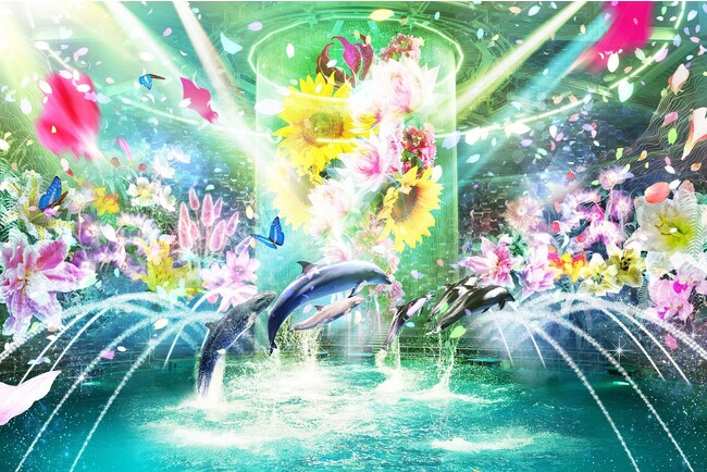 イルカたちのダイナミックなジャンプと呼応するように可憐なデジタルフラワーが次々と咲き、プログラム中盤では水のせせらぎと優美な蓮の花が揺れるシーンで水中パフォーマンスを展開。数々の美しい場面を経て、ゲストを“初夏の海”へ誘い、深い感動をお届けします。