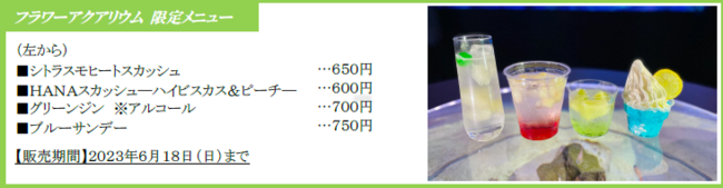 フラワーが咲き誇り、まるで花園のような空間を演出します。こちらではフラワーアクアリウム限定メニューをご用意。レッド・ブルー・グリーンと鮮やかな見た目のドリンクとスイーツは4種類で、館内でのお持ち歩きも可能。