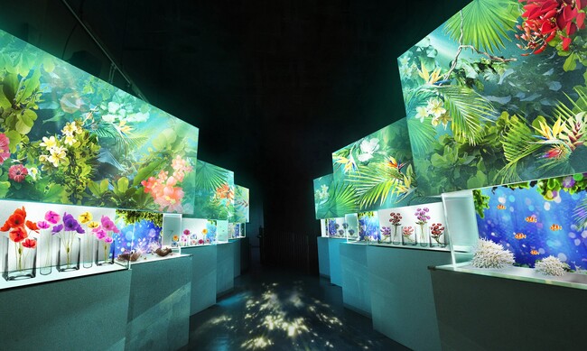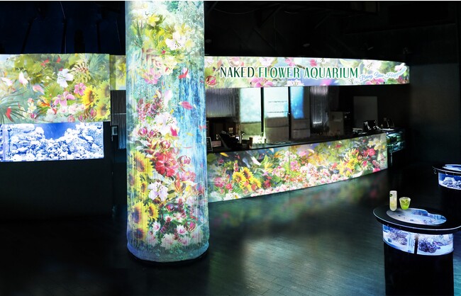 ゲートを抜けてすぐ、エントランスから始まる花と光につつまれた「フラワーアクアリウム」の世界。クリエイティブカンパニー『NAKED, INC.(ネイキッド)』が手掛ける色彩豊かな花々と新緑のデジタルアート、その中で舞泳ぐ魚たちがゲストをお迎えします。その後もパフォーマンス会場までのワンウェイには、“初夏の森”をイメージしたボタニカルな展示空間や“海に咲く花”を連想するイソギンチャクの水槽が連なる小道、花園のようなカフェバーではカラフルな期間限定メニューを提供します。