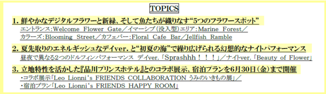 デジタルテクノロジーで描く、花が咲き、緑芽吹く海の世界から“初夏の絶景”をお届け。立地特性を活かした宿泊プランもご用意し、大型連休の観光需要にもお応えします。