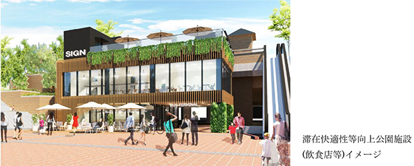 具体的には、芝生広場やベンチの設置による日常的な憩いの場の提供や、滞在快適性等向上公園施設(飲食店等)の設置を通じた利便性・滞留性の向上を図るとともに、様々なイベントにも利用可能な交流空間を形成します。なお、同制度を活用した公園整備は関西初となります。