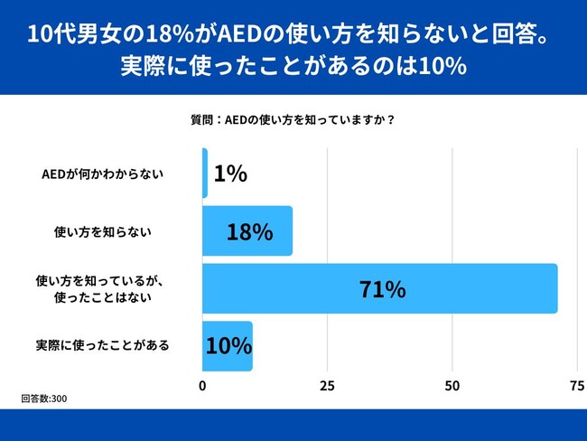 10代の男女を対象とした「AEDの使い方を知っていますか?」というアンケートで最も多かった回答は「使い方を知っているが、使ったことはない」で71%でした。