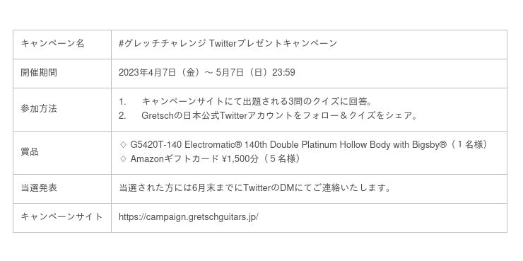 Gretsch(R) 創業140周年を記念して、2023年4月7日(金)~5月7日(日)の期間中、Twitterプレゼントキャンペーン「#グレッチチャレンジ」を開催いたします。本キャンペーンでは、Gretsch(R)にまつわる3つのクイズに挑戦いただき、Gretsch(R)の日本公式Twitterアカウントをフォロー&クイズの回答結果をツイートしていただいた方の中から抽選で1名様にGretsch(R)140周年記念モデルを、5名様にAmazonギフトカード 1,500円分をプレゼントいたします。