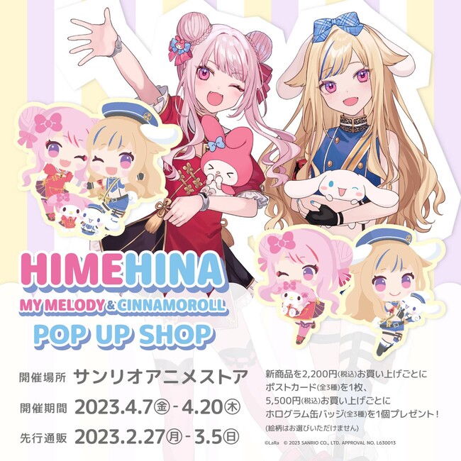 株式会社A3は、バーチャルアーティスト「HIMEHINA」とマイメロディ&シナモロールのコラボPOP UP SHOP開催、ならびに新作グッズ販売を開始いたします。