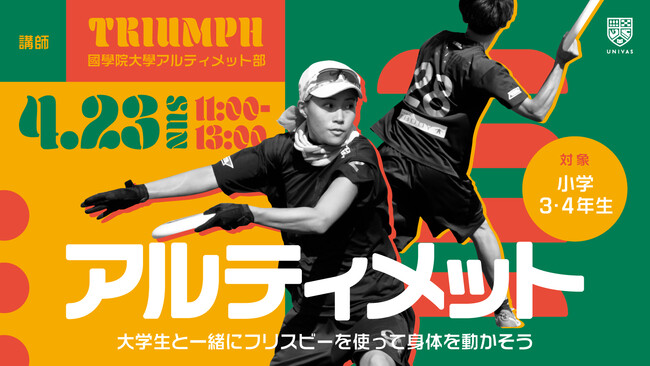 一般社団法人大学スポーツ協会(所在地:東京都千代田区、会長:福原紀彦、以下 UNIVAS)は、國學院大學アルティメット部「TRIUMPH(トライアンフ)」、日本フライングディスク協会、一般社団法人渋谷未来デザインと連携して、渋谷区の小学生にスポーツの魅力とアルティメットの楽しさを体現してもらうため、アルティメット体験イベントを4月23日(日)に開催いたします。