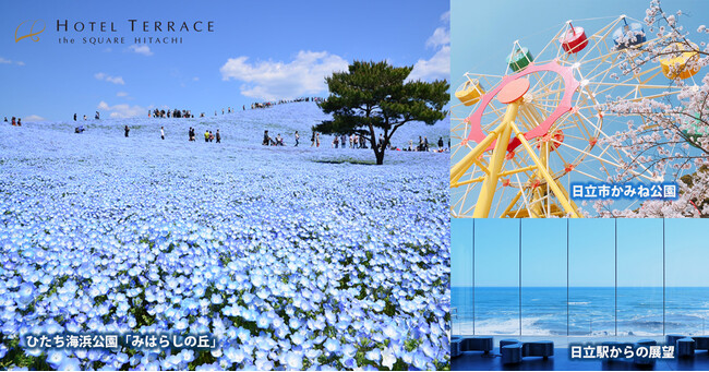 様々なメディアに取り上げられ、国内外から注目されている絶景スポット、ひたち海浜公園で「みはらしの丘」という、水色のネモフィラで埋め尽くされた絶景の丘を散策した後、海岸沿いに北上(車で40分、約25km)し、バイキングの夕食もおススメのコースです。