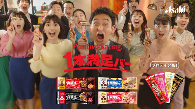 ラストカットでは、「1本満足バー」で社会に元気や前向きな気持ちを増やしたいという思いから生まれたブランドキーメッセージ「Positive Eating.」と共に4月にリニューアルしたブランドロゴと商品パッケージを表示しています。