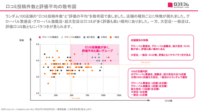 ランダム100店舗の”口コミ投稿件数”と”評価の平均”を散布図で表しました。店舗の種別ごとに特徴が現れました。グローバル繁盛店・グローバル旗艦店・超大型店は口コミが多く評価も高い傾向にありました。一方、大型店・一般店は、評価口コミ数ともにバラつきが見られます。