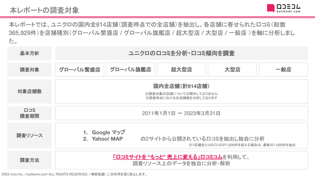 レポートをくわしく見る(無料) → https://academy.kutikomi.com/whitepapers/202304_uniqlo/?utm_source=pressrelease&utm_medium=prtimes&utm_campaign=202304_uniqlo ■ 本レポートの調査対象