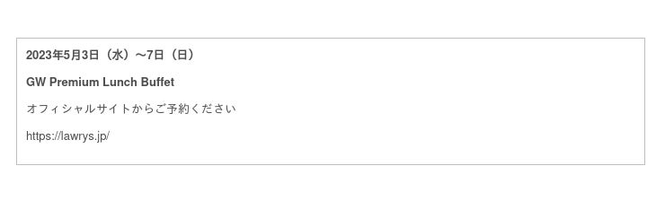 株式会社ワンダーテーブル[本社:東京都新宿区西新宿 / 代表取締役社長 秋元 巳智雄(以下、 当社)]が運営するアメリカンローストビーフ専門店「ロウリーズ・ザ・プライムリブ(以下、ロウリーズ)」は、2023年5月3日(水)~7日(日)、いつもより豪華なアイテムが楽しめる”GW Premium Lunch Buffet”を開催します。