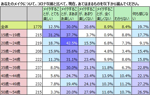 当社が2022年11月に実施した自社調査(調査方法:インターネット n=1,779 対象:年齢15歳~54歳女性)では、コロナ前と比べて、「メイクが楽しくなった」と答えた女性は42.5%、「メイクが楽しくない」と答えた女性は29.5%で、全体ではメイクをすることが楽しいと答えている女性の方が多いことがわかりました。年代で見てみると、15歳~19歳の若年層では、「メイクが楽しい」が68.9%、「メイクが楽しくない」が4.6%と圧倒的ですが、年齢を重ねるにつれ「メイクが楽しくない」と答える割合が増えていき、35歳~39歳では、「楽しい」が38%に対して「楽しくない」が32.9%、40歳~44歳では、「楽しい」が30.3%で、「楽しくない」が37.3%と、楽しい割合よりも楽しくない割合が多くなり、年齢を重ねるほど楽しくないと答える割合が増えていくことがわかっていますが、40歳が「メイクが楽しい」と思う境目であるようです。