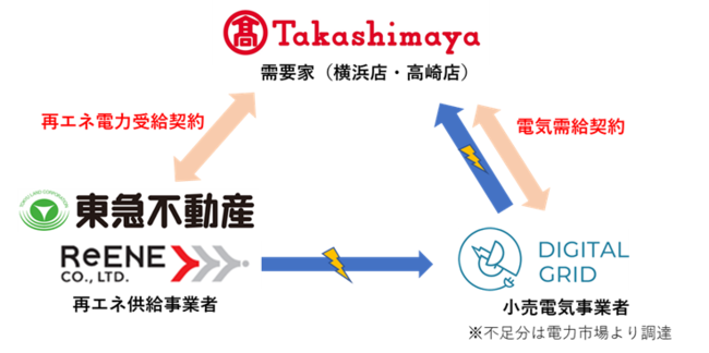 株式会社高島屋(本社:大阪市中央区、代表取締役社長:村田善郎、以下「高島屋」)、東急不動産株式会社(本社:東京都渋谷区、代表取締役社長:星野浩明、以下「東急不動産」)、株式会社リエネ(本社:東京都渋谷区、代表取締役:西田恵介、以下「リエネ社」)、デジタルグリッド株式会社(本社:東京都港区、代表取締役社長:豊田祐介、以下「デジタルグリッド社」)の4社は、速やかな脱炭素社会への移行と、日本国内の再生可能エネルギー(以下「再エネ」)の普及に向け、短期契約による大規模オフサイト型コーポレートPPAの実証的な取り組みを国内で初めて ※1開始いたします。