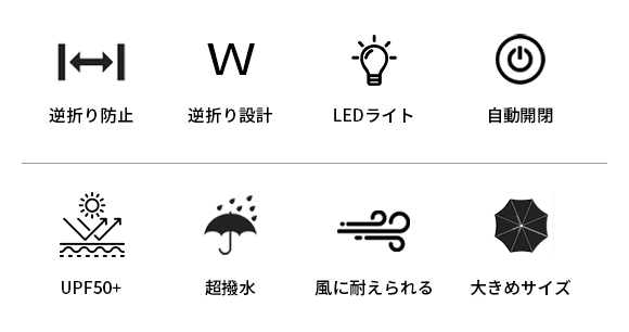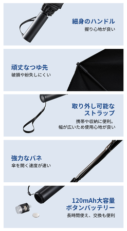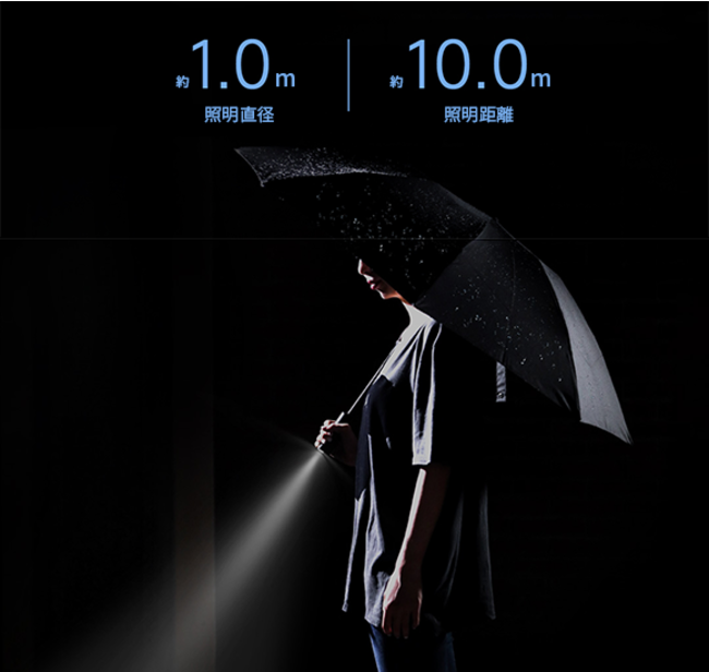 LEDライトが傘の持ち手に内蔵されています。ワンタッチで点灯し、約10m先まで照らします。わざわざポケットから携帯電話を取り出して照明機能をオンにする必要はないため、手がふさがっていても問題ありません。