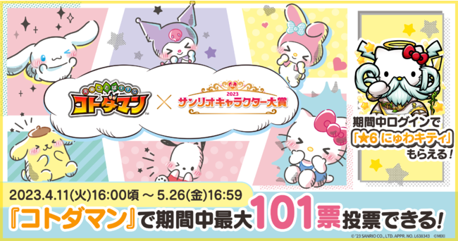 ・コラボ期間中、「2023年サンリオキャラクター大賞」の投票券を最大101枚もらえる! ・「2023年サンリオキャラクター大賞」上位入賞キャラクターのコトダマン化が決定!