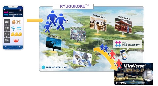 凸版印刷が提供する、高精細・低遅延なリアルタイムレンダリング機能を持つビジネス向けメタバースサービス基盤「MiraVerse(R)(読み: ミラバース)」と、JP UNIVERSEが提供するファンタジーな世界観とゲームの要素を持つメタバース・プラットフォーム「RYUGUKOKU™(読み: リュウグウコク)」の相互運用実現を目指します。新しい社会インフラとして国内企業の情報発信、マーケティング、働き方改革を始めとする産業界のDXを支援します。